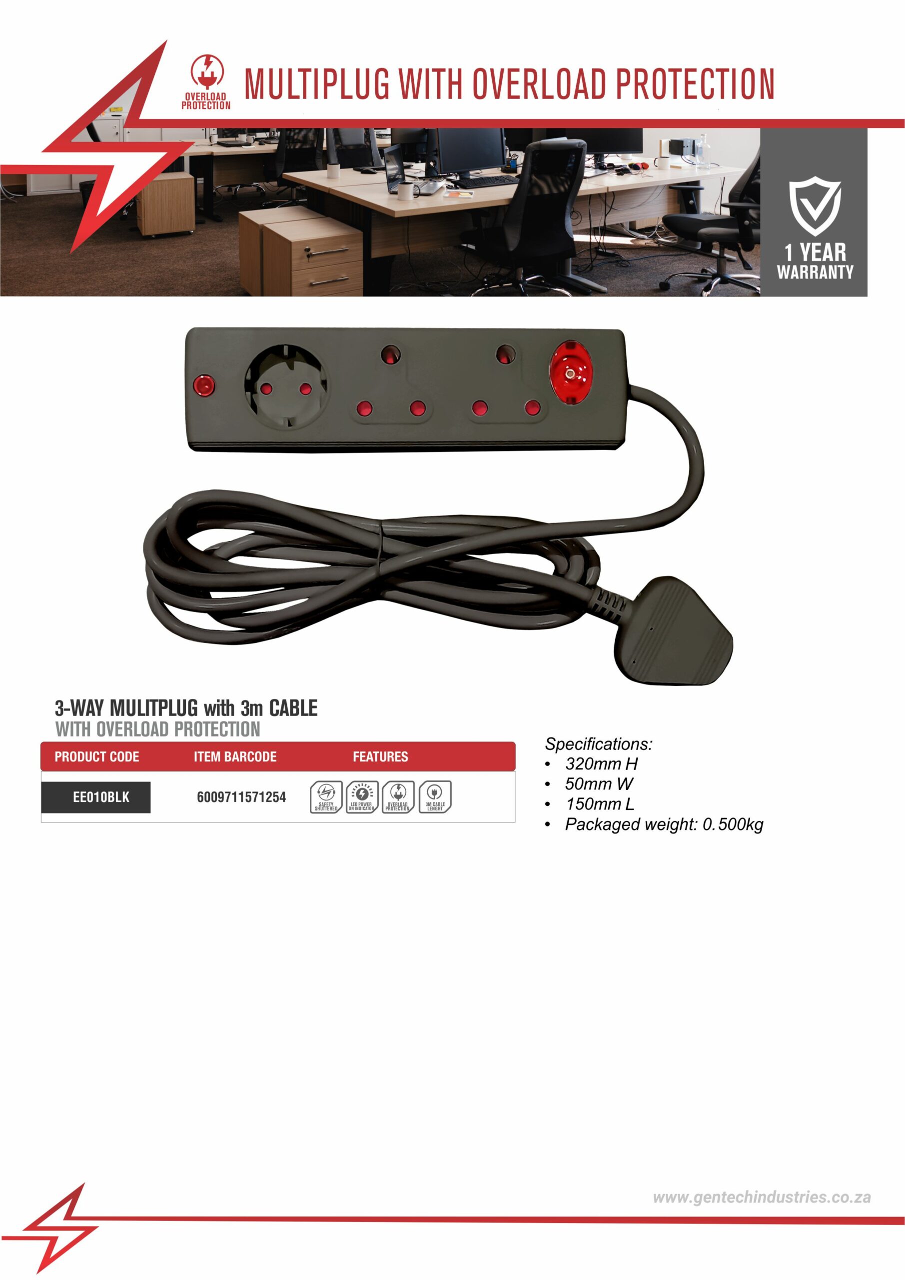 / ELECTRICMATE 3-WAY MULTIPLUG WITH 3M CABLE WITH OVERLOAD PROTECTION BLACK