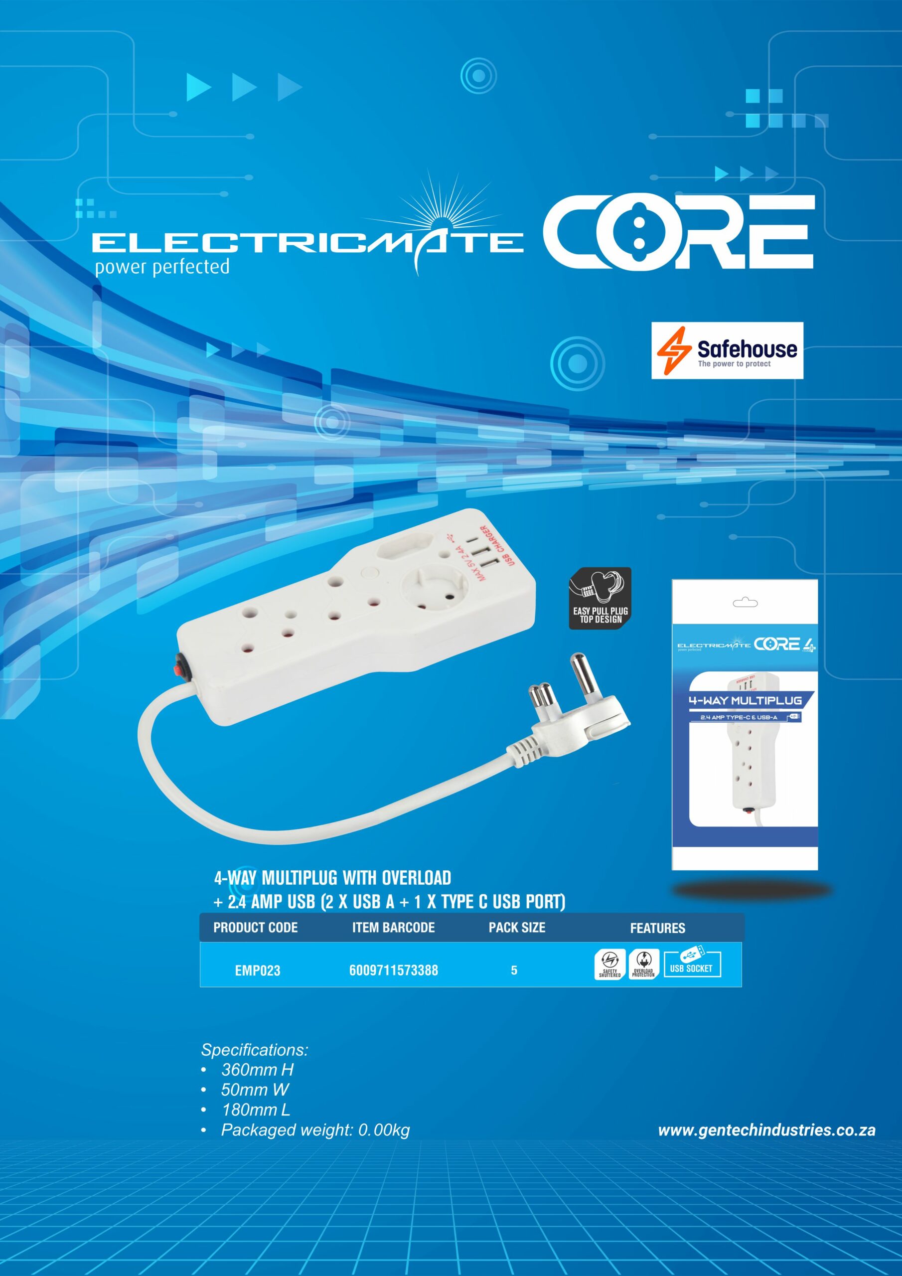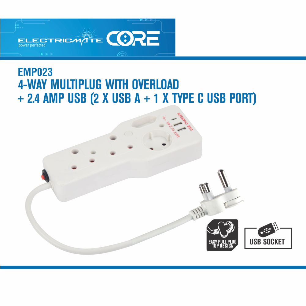 Electricmate Core 4-way Multiplug With Overload + 2.4 Amp USB (2 X USB A + 1 X Type C USB Port) I 1 Year Warranty