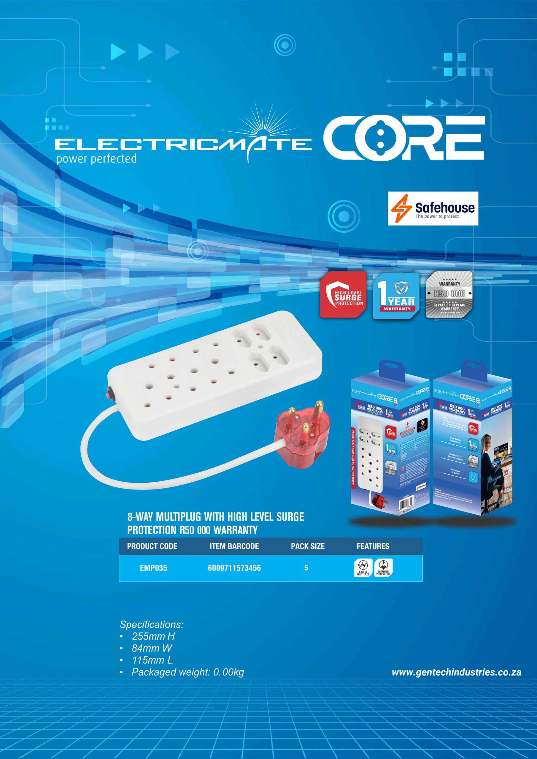 Electricmate Core 8-Way Multiplug With High Level Surge Protection R50 000 Warranty I 1 Year Warranty