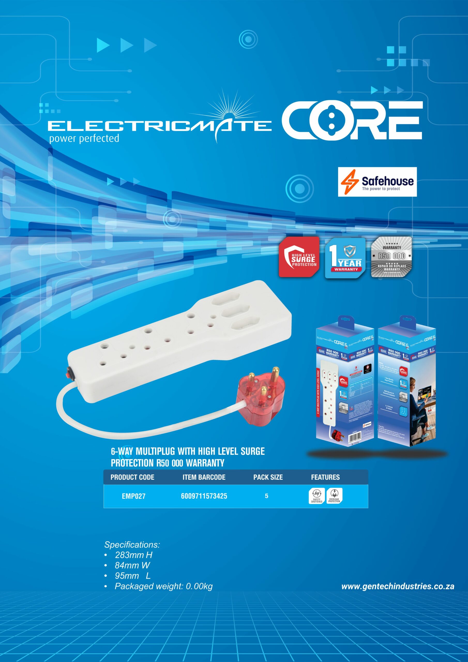 Electricmate Core 6-Way Multiplug With High Level Surge Protection R50 000 Warranty I 1 Year Warranty
