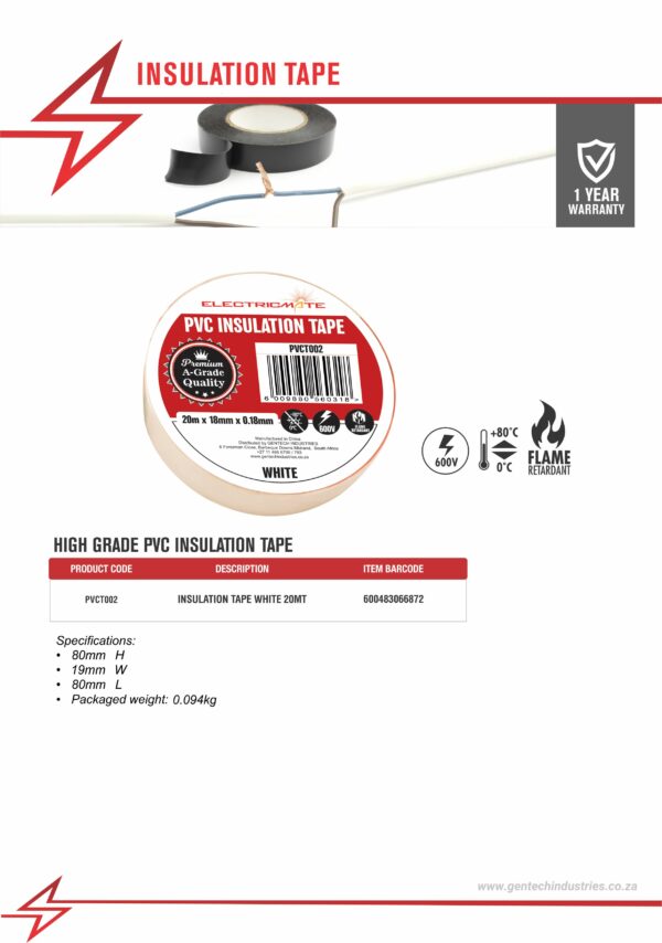 ELECTRICMATE HIGH GRADE PVC INSULATION TAPE WHITE 20M