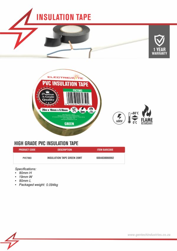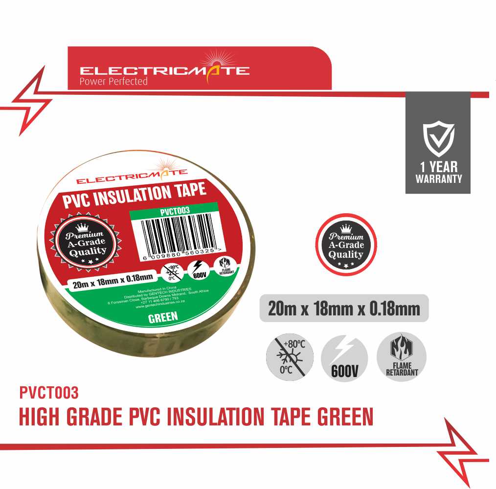 ELECTRICMATE HIGH GRADE PVC INSULATION TAPE GREEN 20M