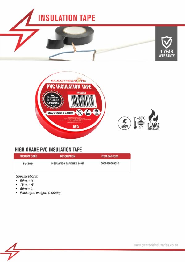 / ELECTRICMATE HIGH GRADE PVC INSULATION TAPE RED 20M