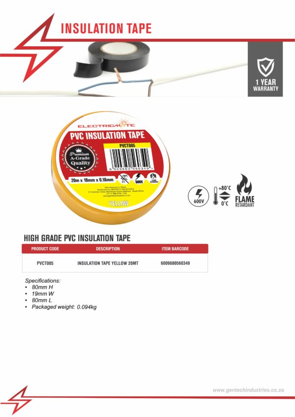 / ELECTRICMATE HIGH GRADE PVC INSULATION TAPE YELLOW 20M