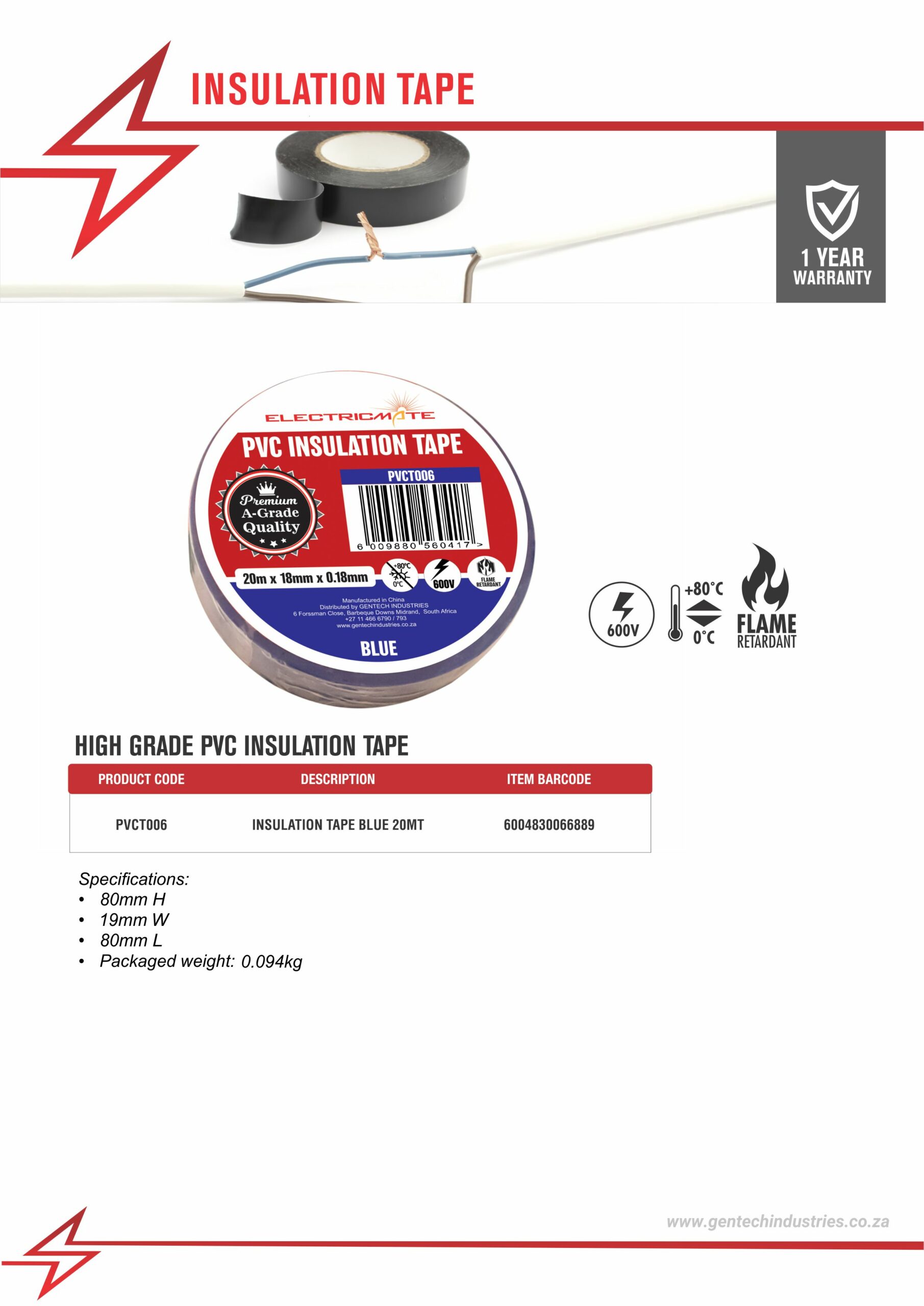 / ELECTRICMATE HIGH GRADE PVC INSULATION TAPE BLUE 20M