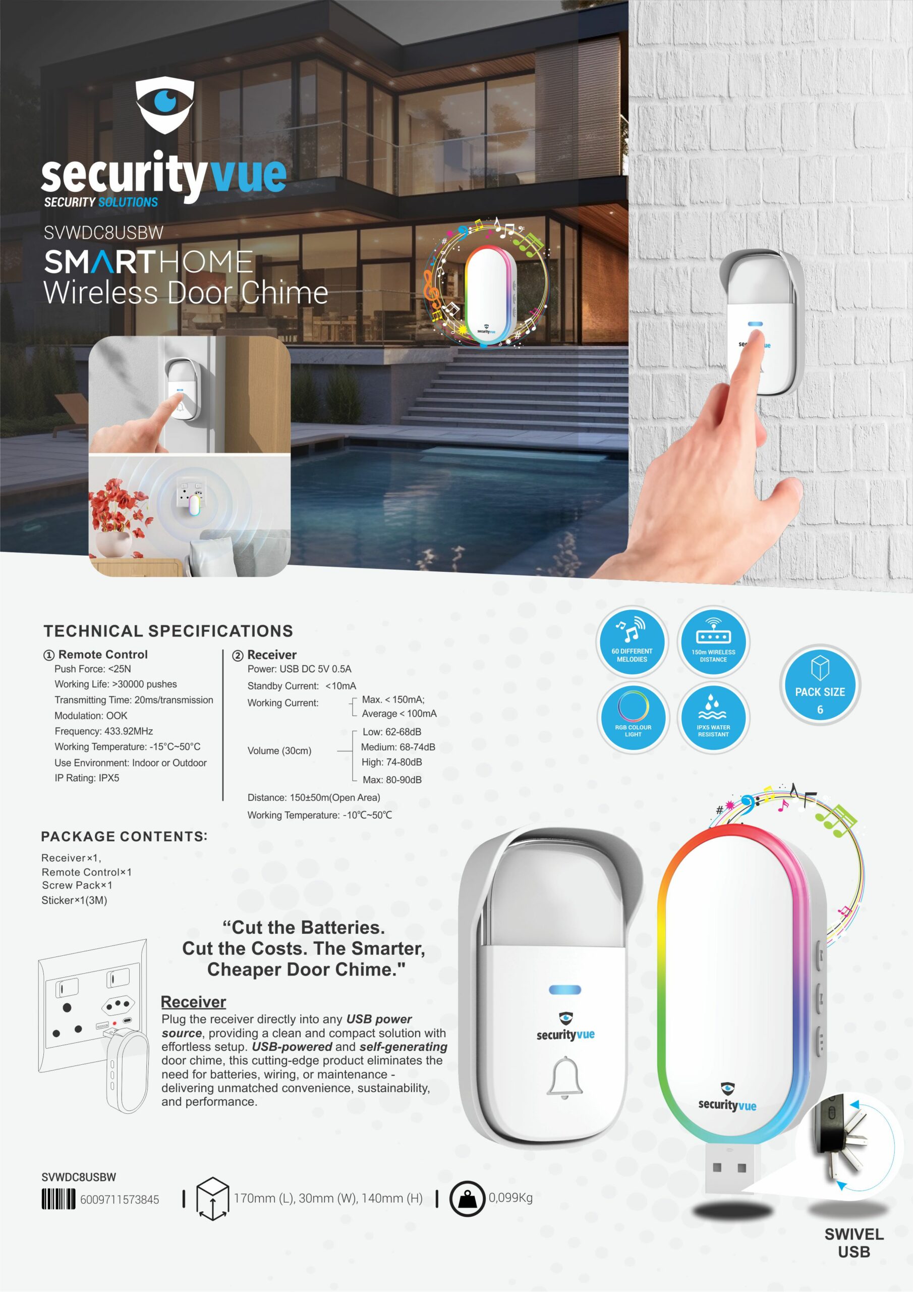 Wireless USB Door Chime 150m Distance Powered By USB & Kinetic Energy White I 1 Year Warranty